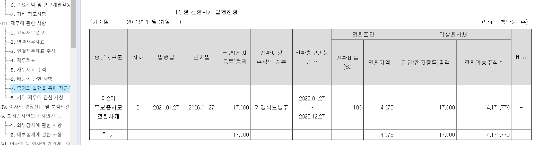 전환가능주식수를 보면 얼마나 주식이 추가될 수 있는 지를 알 수 있다. (예전에는 자본금 변동사항에 이런 게 나와 있음)